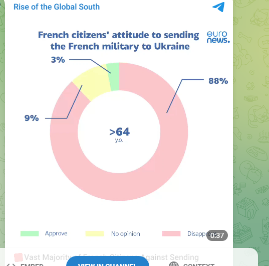 Mehrheit der Franzosen gegen Marcons Ukrainepolitik, je älter die Befragten, um so größer ist die Ablehnung, aber auch bei den jungen gibt es eine Mehrheit gegen die Entsendung von Truppen in die Ukraine.